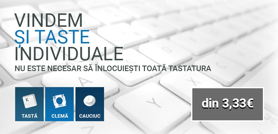 Tastepentrutastatura.ro este un magazin on-line care vinde taste individuale pentru tastaturi calculatoare, elemente de prindere pentru taste, trackpoint-uri și produse de curățare calculator. În oferta noastră găsești butoane pentru laptop, butoane pentru netbook, butoane pentru palmtop, butoane pentru tabletă, butoane pentru calculator, butoane pentru tastatură fără fir și butoane pentru tastatură cu fir. În cazul în care, tastele Tale de la tastatura calculatorului sunt deteriorate sau ai dispozitiv cu taste lipsă - problema ta o rezolvi cu ajutorul ofertei noastre.