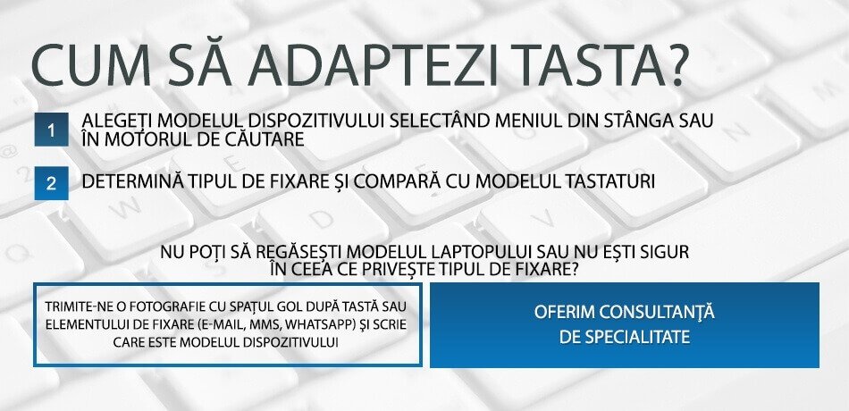 Tastatura Ta Acer , Apple , Asus , Dell , Lenovo , Gateway , HP , Medion , MSI , Samsung , Sony , Toshiba sau oricărui alt producător a fost deteriorată? Nu ești sigur dacă tasta se va potrivi cu laptop-ul Tău? Te întrebi dacă clema de fixare este același ca în dispozitivul Tău? Nu știi cum să elimini un buton defect? Ai comandat un buton de rezervă, dar ai îndoieli cu privire la modul în care să-l instalezi? Dorești să înlocuiești o tastă rupt, dar nu poți găsi modelul în magazin pentru dispozitivul Tău? Contactează-ne Cu mare drag te vom ajuta.